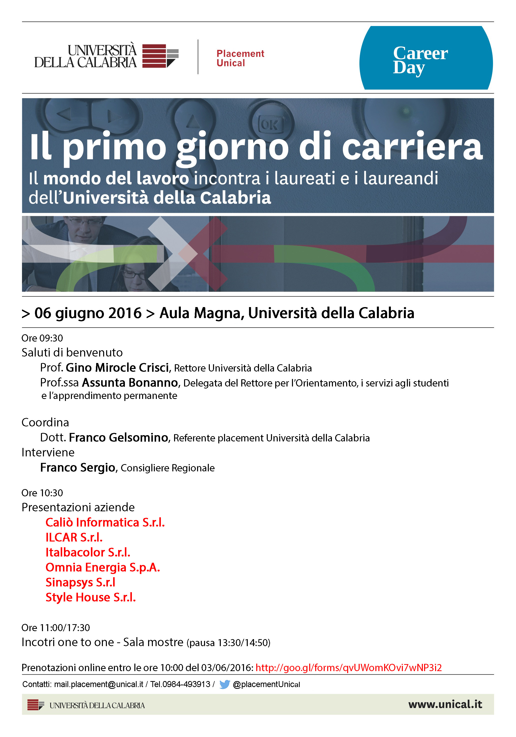 “Il primo giorno di carriera” è il titolo del Career Day 2016 organizzato anche quest’anno dall’Università della Calabria per promuovere e attuare iniziative per favorire l’incontro tra i suoi laureati e il mondo del lavoro. Le aziende partecipanti hanno presentato il loro business, il settore in cui operano, le necessità in termini di risorse umane e hanno presentato in modo dettagliato le loro aspettative; nel contempo gli studenti hanno potuto dialogare in modo diretto con i responsabili aziendali e conoscere i fabbisogni di capacità e competenze ricercate.